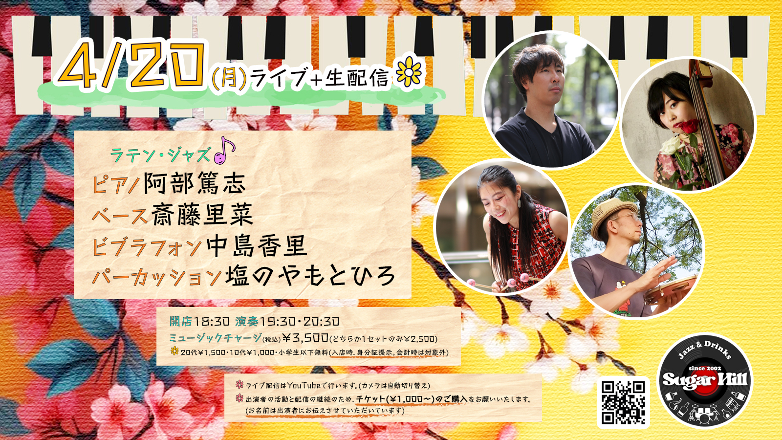 ピアノ阿部篤志 ベース斎藤里菜 ビブラフォン中島香里 パーカッション塩のやもとひろ