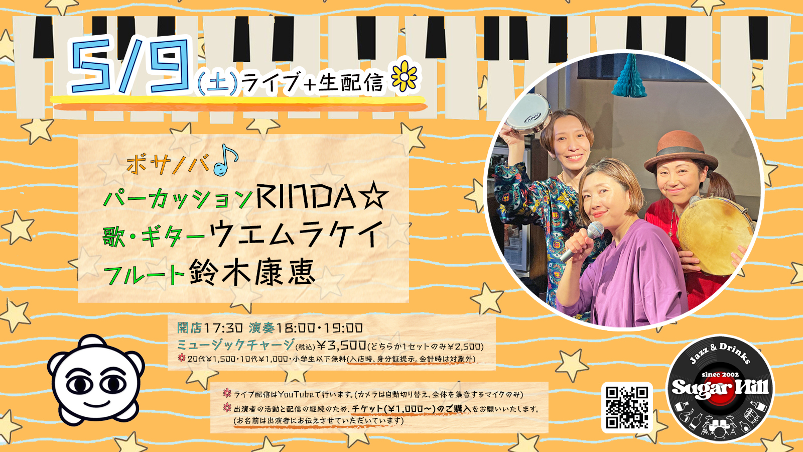 パーカッションRINDA☆ ボーカル・ギター ウエムラケイ フルート鈴木康恵